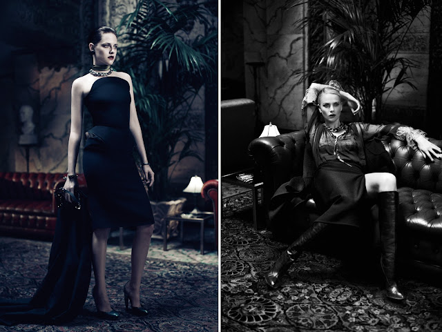 Sensuales, oscuras y llenas de misterio, Stewart y Theron son retratadas con vestidos y joyas que ensalzan una sombría sofisticación.